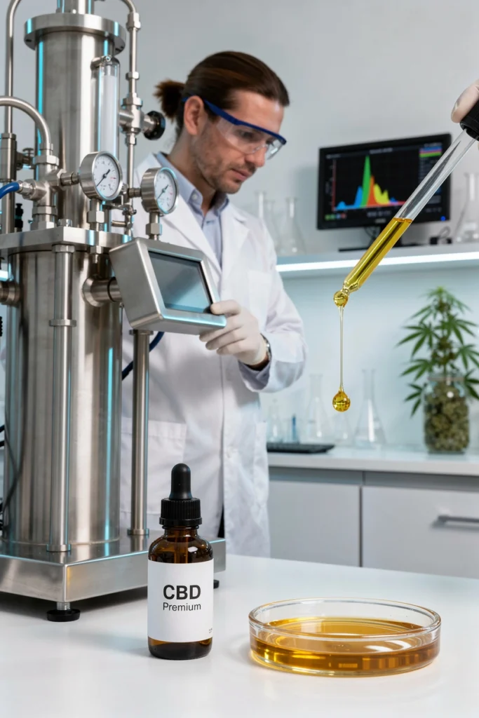 Cette méthode est considérée comme la plus propre et la plus efficace pour obtenir un extrait de CBD de haute qualité. Le CO2 supercritique agit comme un solvant puissant capable d’extraire les cannabinoïdes et les terpènes sans laisser de résidus toxiques. Le processus se déroule à basse température, ce qui préserve la structure moléculaire des composés sensibles.